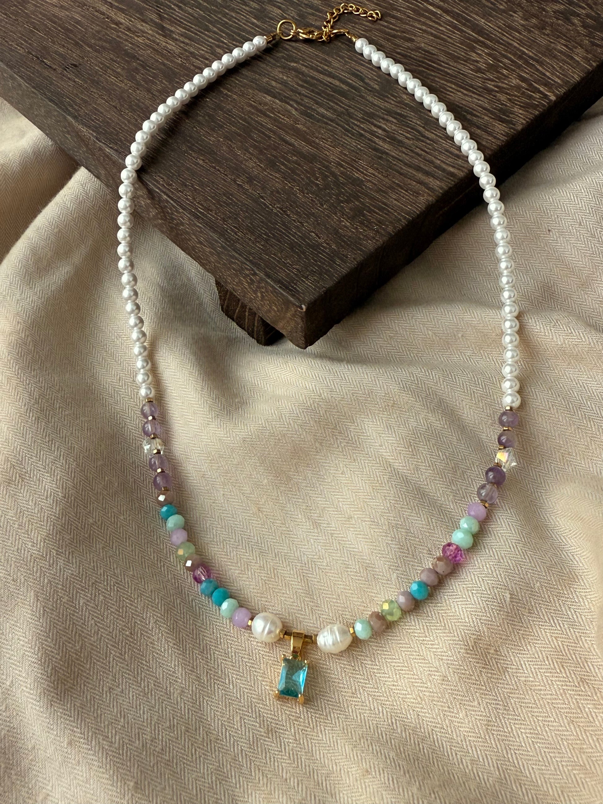 Χειροποίητο κολιέ με πέρλες , αμέθυστο και χρωματιστές χάντρες, δύο κεντρικά μαργαριτάρια καλλιέργιας και κρεμαστό κρύσταλλο σε τιρκουάζ απόχρωση.