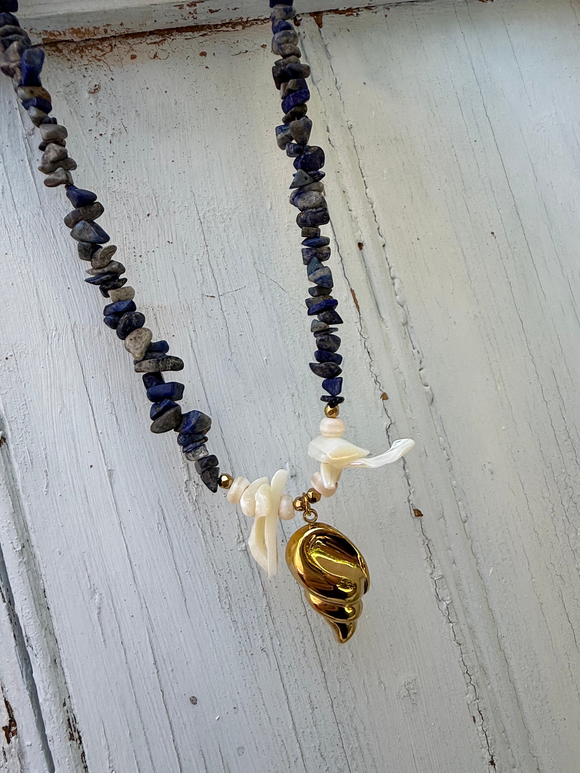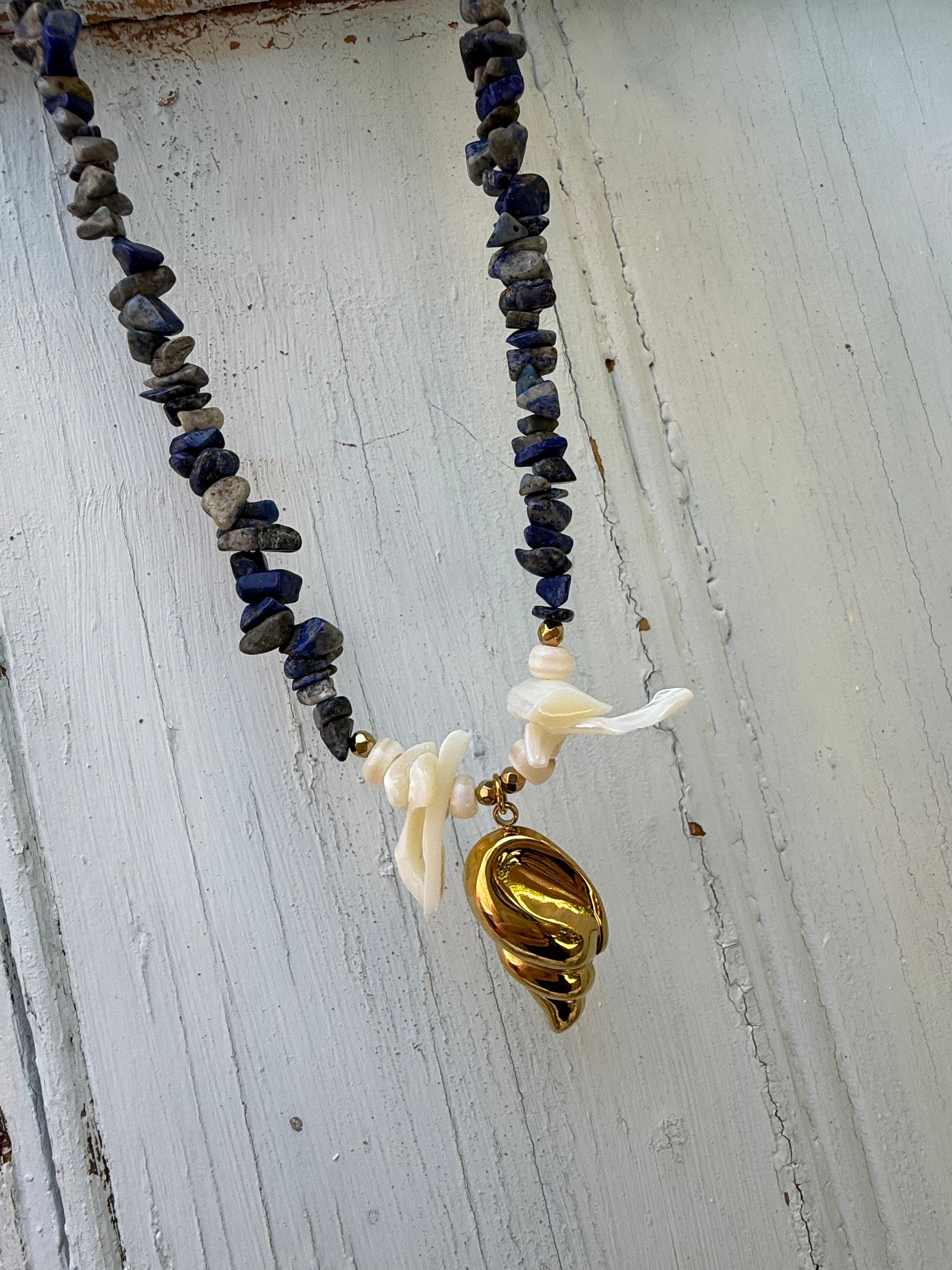 Χειροποίητο κολιέ από κοράλλι τσιπς σε μπλε απόχρωση , το κρεμαστό στοιχείο είναι από επιχρυσωμένο ανοξείδωτο ατσάλι.