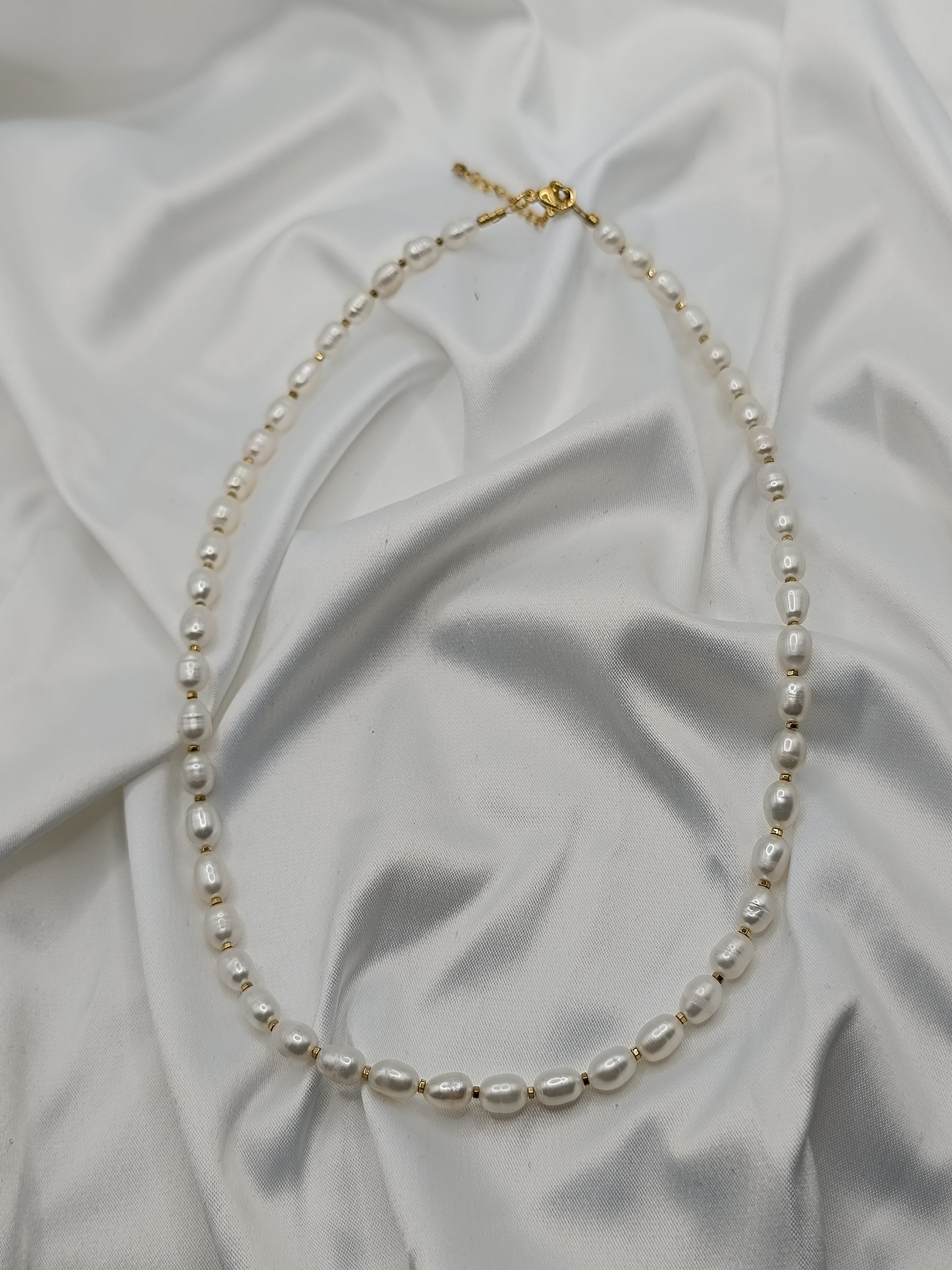 Ένα υπέροχο Χειροποίητο κολιέ με φυσικά μαργαριτάρια καλλιέργειας, και ενδιάμεσες χάντρες από επιχρυσωμένο αιματίτη.