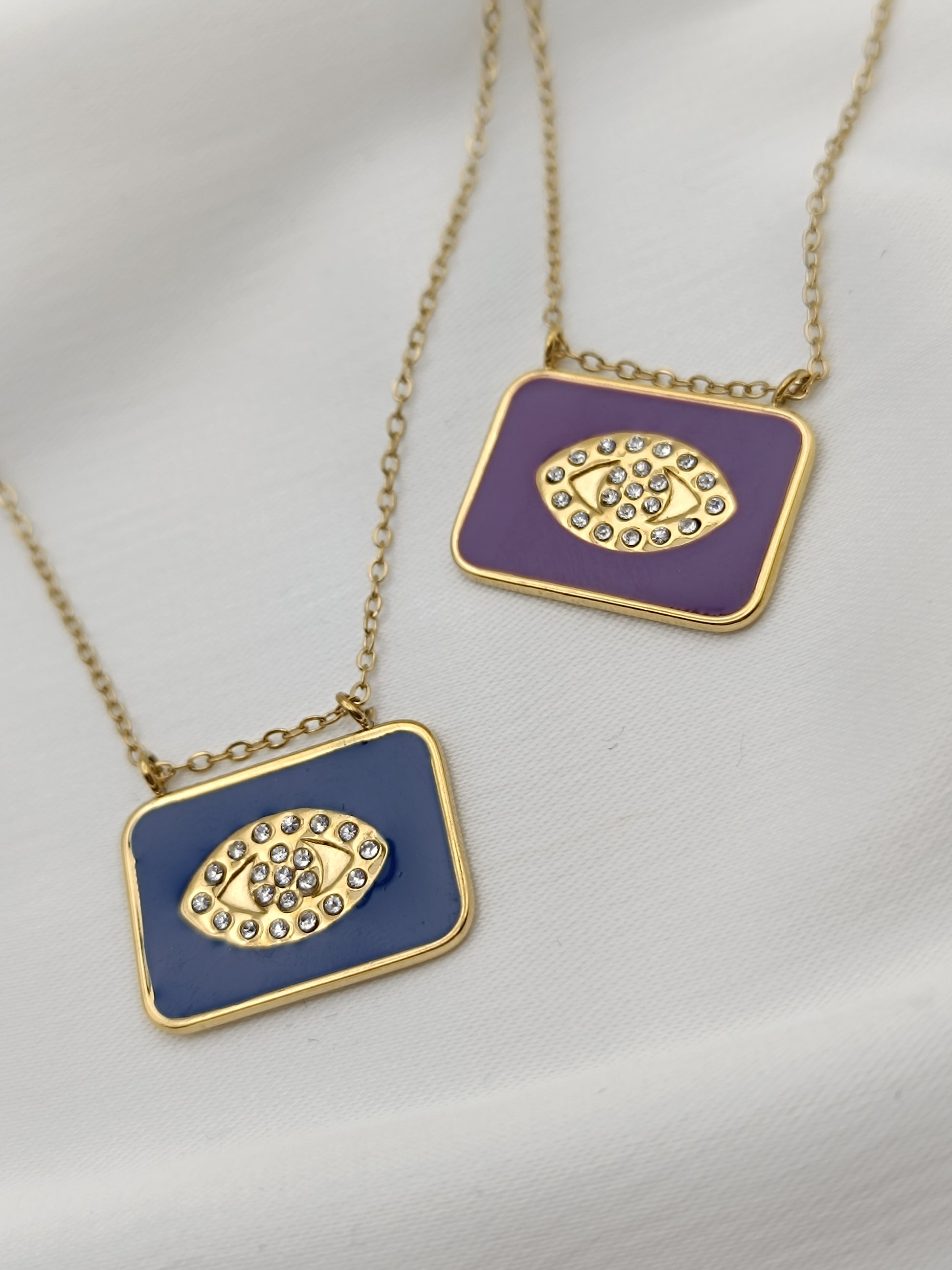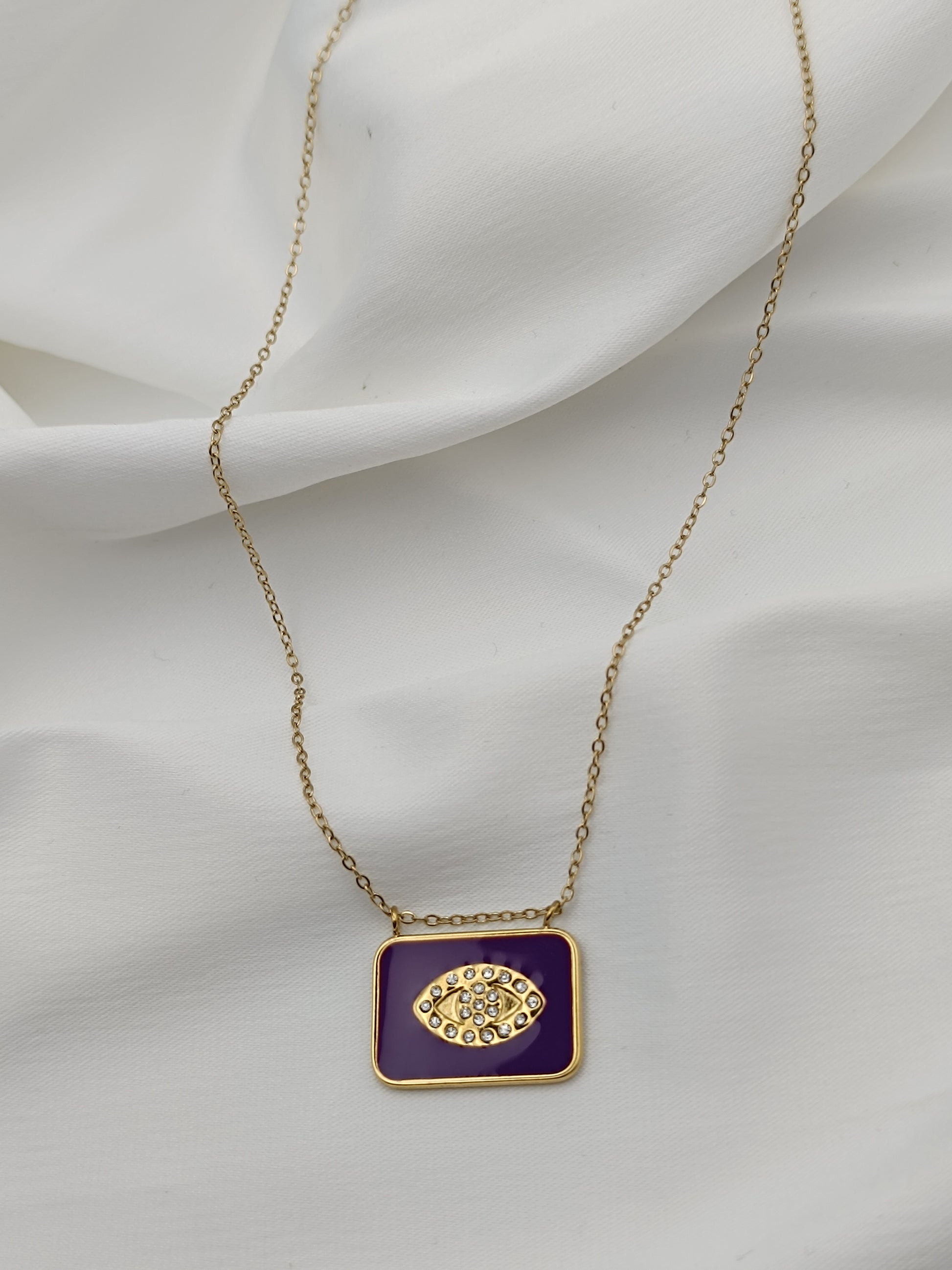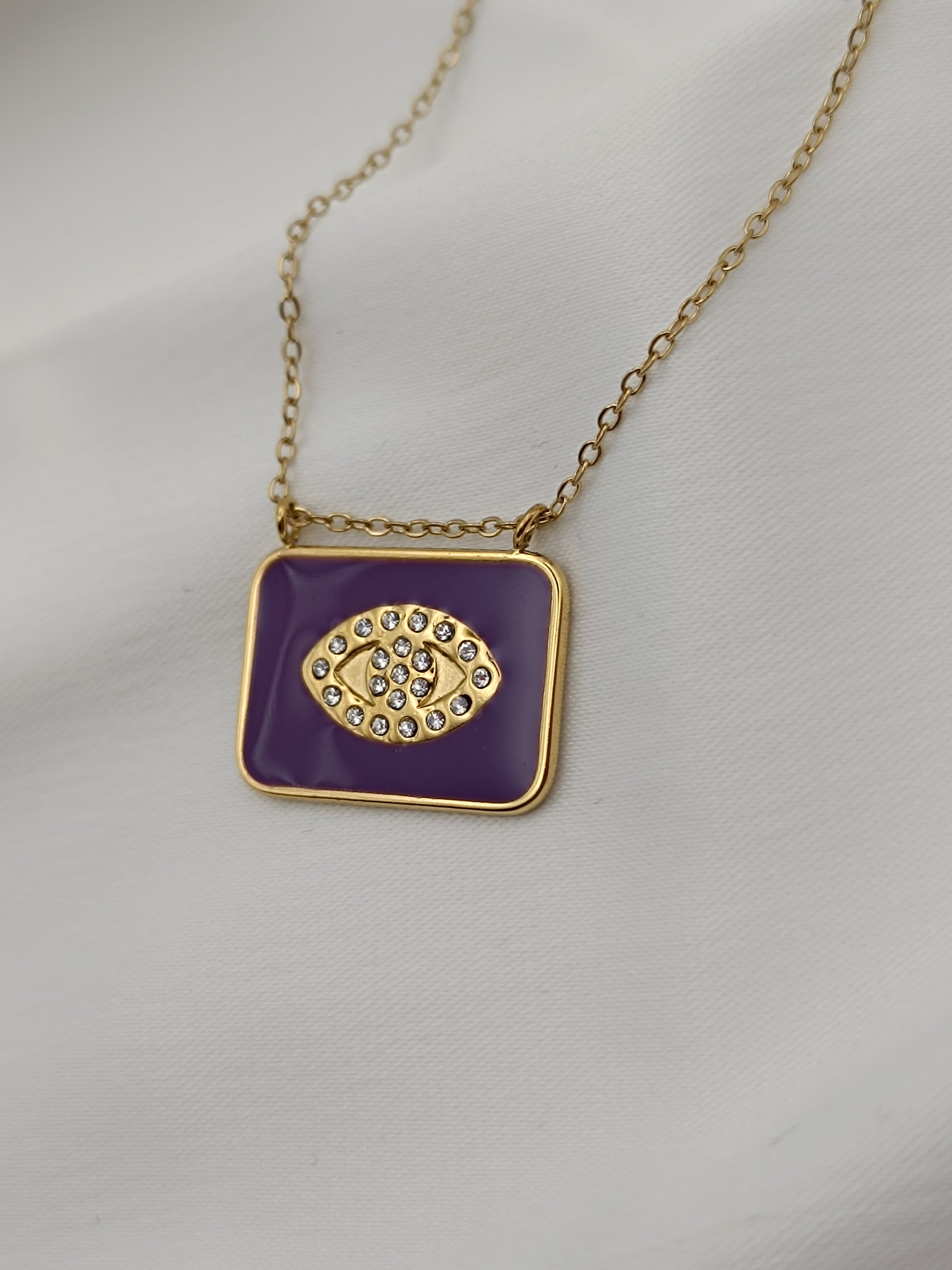 Κολιέ με τετράγωνο στοιχείο με μωβ σμάλτο διακοσμημένο με ζιργκόν σε σχήμα ματιού.