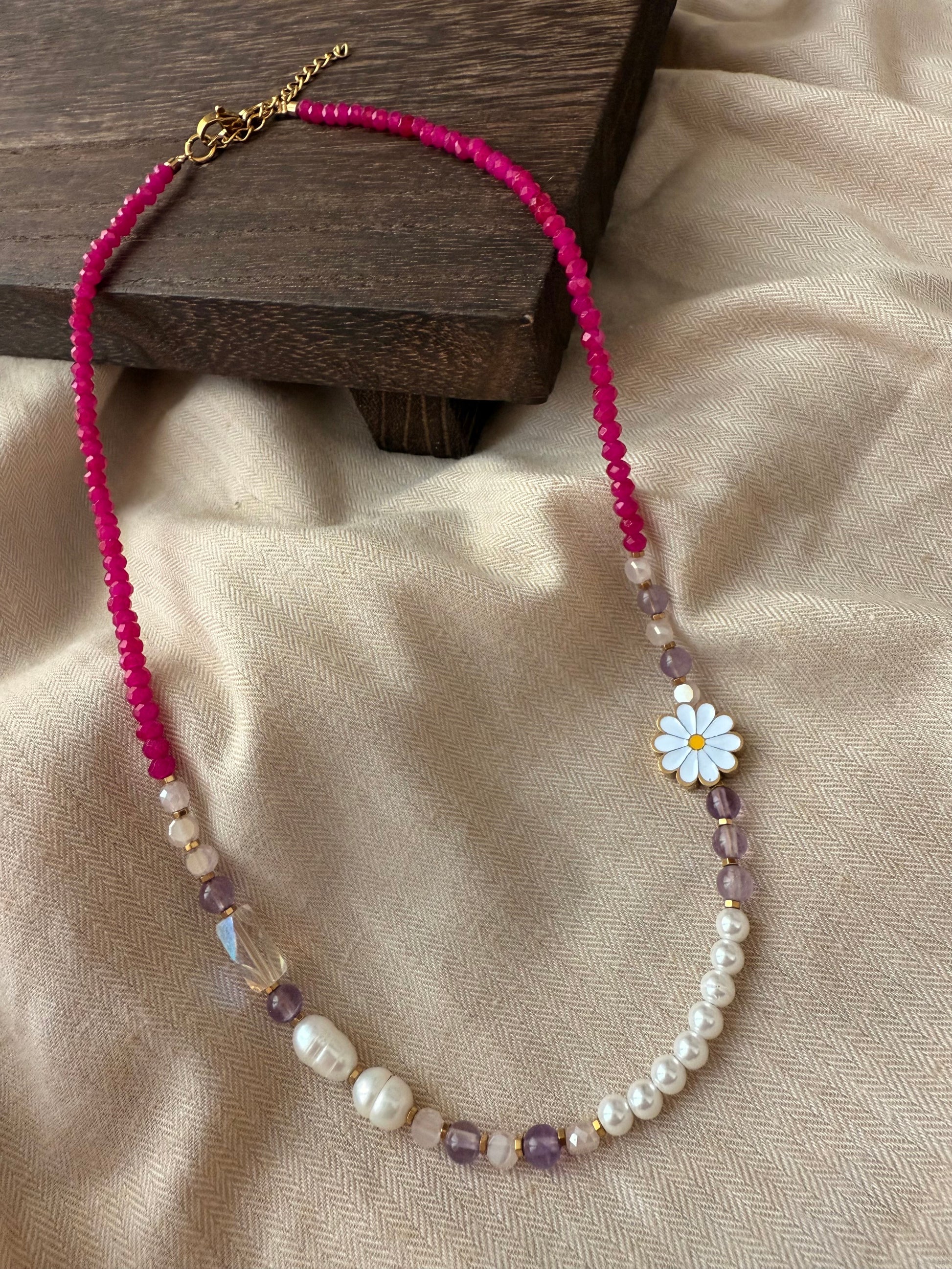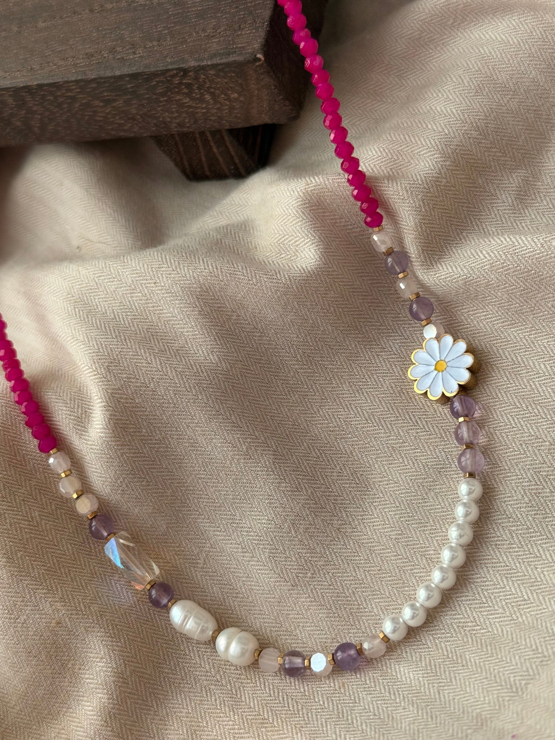 Χειροποίητο κολιέ με φούξια χάντρες, αμέθυστο,κρύσταλλα και μαργαριτάρια καλλιέργειας.