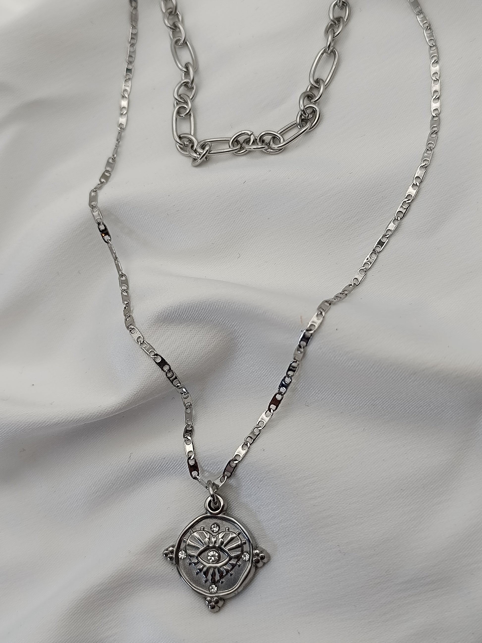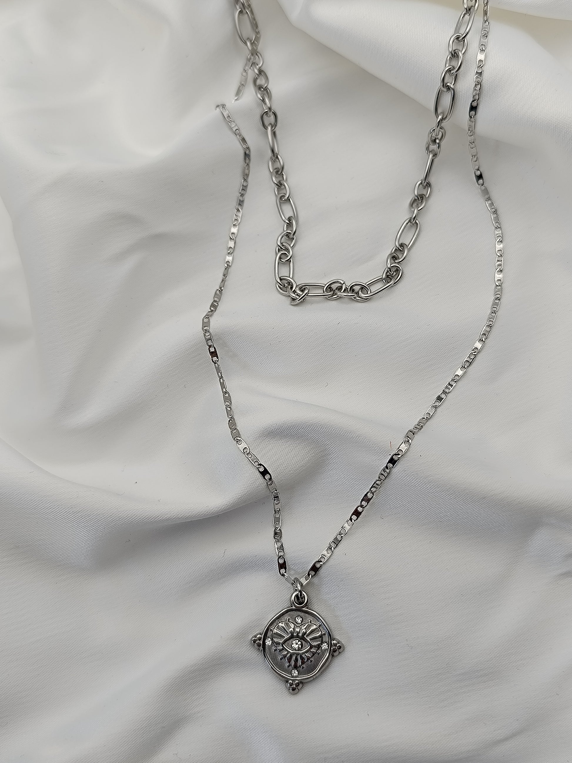 Διπλό κολιέ χειροποίητο με διαφορετικές αλυσίδες και κρεμαστό στοιχείο.